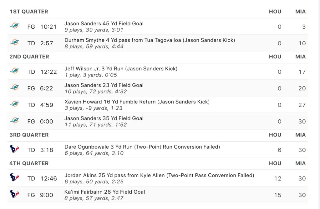 The Dolphins’ Time Margin in their 30-15 win over the Texans a couple weeks ago would have been 48. Which is much more of a fair measure of how dominant the team was to anyone who watched the game. The logic behind the number 48 is that at 3 minutes left in the first the Dolphins went up by more than one possession (>/=8 Points). As the game went on the Texans failed to get the game within one score. The inputs into the metric are play by play scoring summaries. The logic behind taking the time left in the game where the winning team went up by more than 8 points and never let their lead go under that margin is as follows: hypothetically the trailing team can tie the game on any single play if the margin is 8 points or less. Even if the team is on defense they could get a Pick 6 and a two point conversion, and then the game is tied.