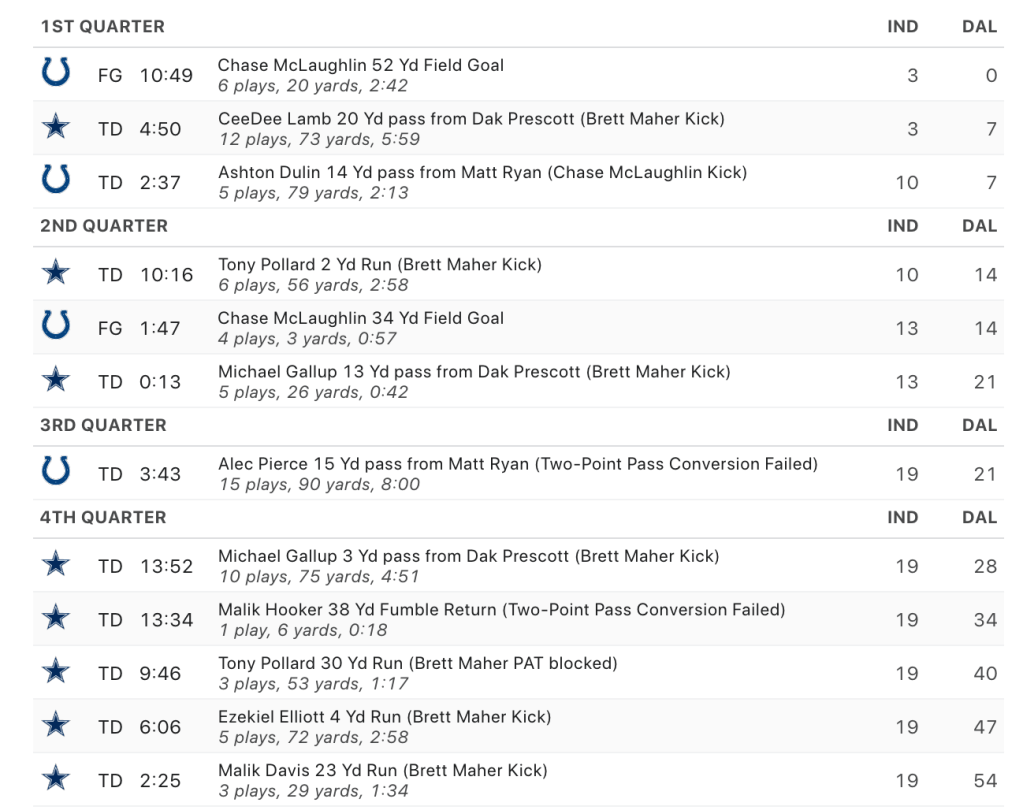 As you can see this game was clearly competitive and in-question going into the fourth quarter as the Cowboys were up by just 2 points heading into the final fourth of the game. The Cowboys won the game by 35 points, now this contradicts what actually happened on the field as the Cowboys struggled to pull away into somewhat late in the game. The Cowboys’ Time Margin would have been +14 and the Colts -14. As Dak Prescott’s Passing TD to Michael Gallup with 13:52 left in the fourth put the Cowboys up by 9. Then the Cowboys strung up four more touchdowns to inflate the final score to look like a massive blowout.